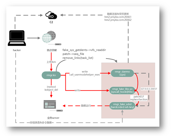 接下来咱们重点分析这组木马文件,根据AV厂商的命名规则(附录1),暂为其命名为"Backdoor:Linux/Rmgr!rookit",其中“rmgr”来至木马代码中多个函数用了rmgr前缀。