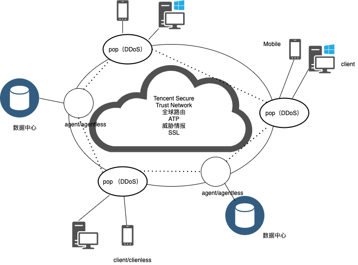 DDoS防护需要支持全球分布的不同类型客户。需要建立pop接入点,尽可能靠近客户,作为安全的接入点,提供时延最小的防护能力和资源获取能力。
