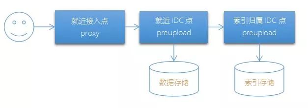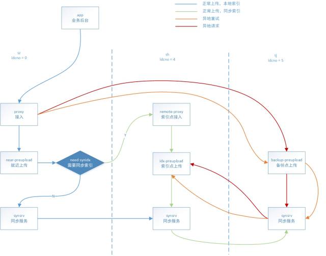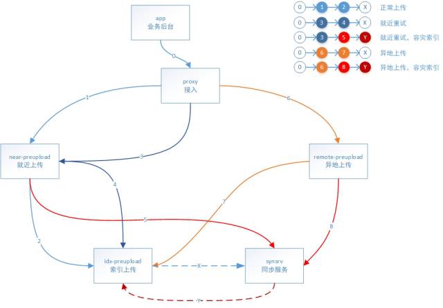 上传 preupload 收到 proxy 的请求,先落地图片数据,如果是容灾上传,需要生成容灾索引发送到 synsrv,普通上传则生成常规索引发送到索引 preupload,然后写 synsrv 备份索引,不进行任何重试。