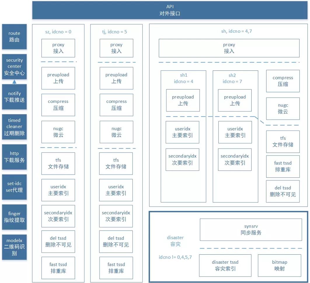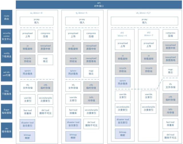 以往的架构调整,大都是用“拆”,但是,随着业务数据量的增长,以及业务需求变化的缓和,我们更加关注系统的稳定性和高可用性,于是此次重构,我们采用了“合”的思路,把 zz 和 rececyle 整合进 preupoad。看上去功能耦合了,preupload 变得更加臃肿,但是从 zz 和 recycle 的功能逻辑来看,和 preupload 是一样的或者很相似的,底层也是共用一套存储,将他们独立部署,时间久了,三个模块的代码逻辑差异越来越大,直接导致开发维护和运维的困难。新架构还把一些已经没用的模块去掉,比如 ckv 系统,原图系统等,然后将原图功能完全接入秒传率更高的微云系统,容灾模块也从原来三地部署、两两互备,变成单独园区部署。重构如图 3 所示。