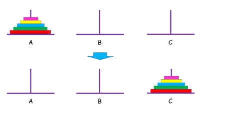 有 A,B,C 三根柱子,A 上面有 n 个盘子,我们想把 A 上面的盘子移动到 C 上,但是要满足以下三个条件: