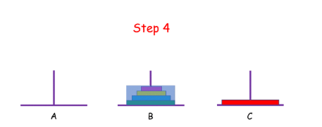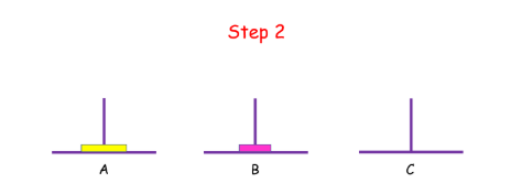 如果 n = 2 呢?这时候我们就要借助 B 了,因为小盘子必须时刻都在大盘子上面,共需要 4 步。(动态图,只截取一部分)