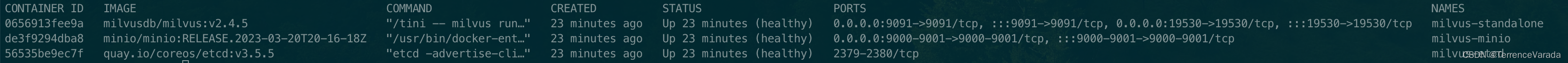 12. 用 docker ps 查看所有正在运行中的容器列表,检查milvus是否正常运行;