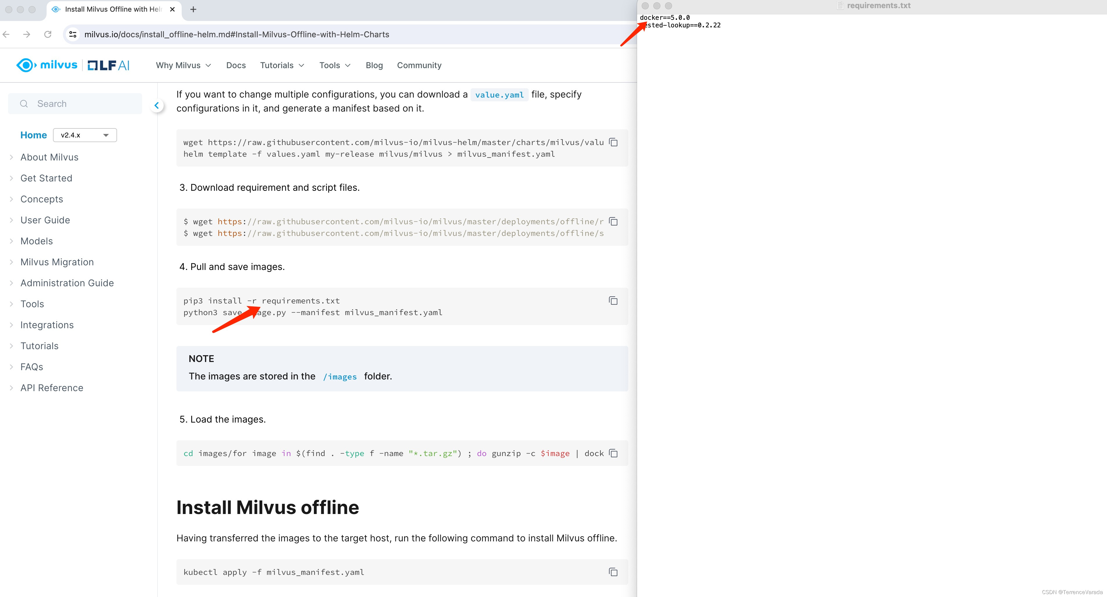 Milvus这个官网教程真是难懂,v 2.4.x 的说明,下载的 milvus_manifest.yaml 文件是 2.2.13。requirements 限制的版本信息在Mac M1 上也跑不通。