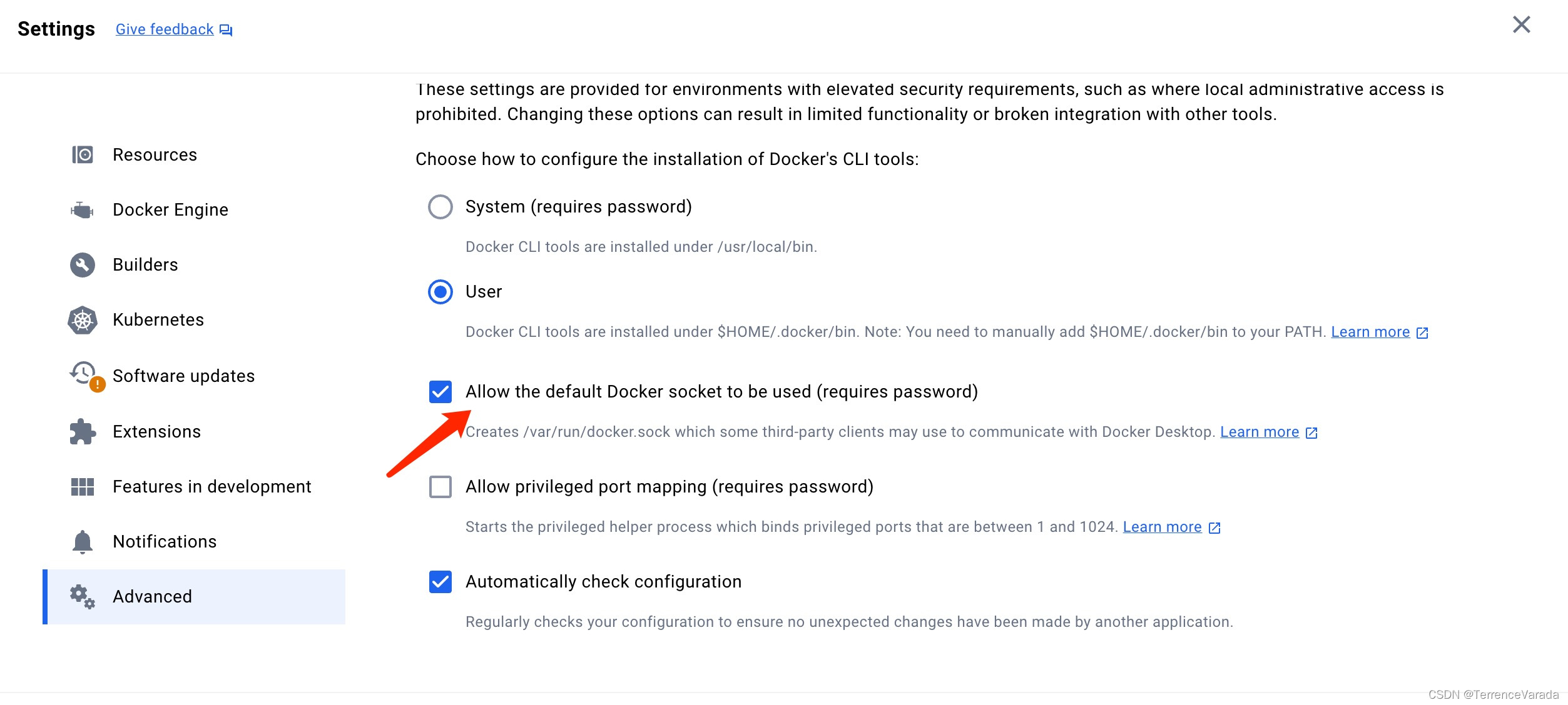 5. 我用的是 Docker Desktop,需要在 advanced 里配置 Allow the default Docker socket to be used;
