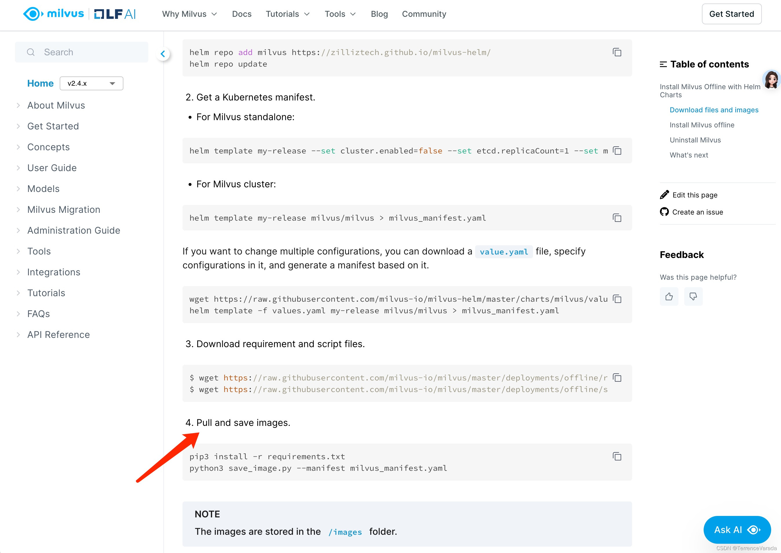 10. 然后这里又有个坑,milvus官网 Load the images 没说要在远程服务器执行。🙄 这里实际是需要的。cd images/; for image in $(find . -type f -name "*.tar.gz") ; do gunzip -c $image | docker load; done