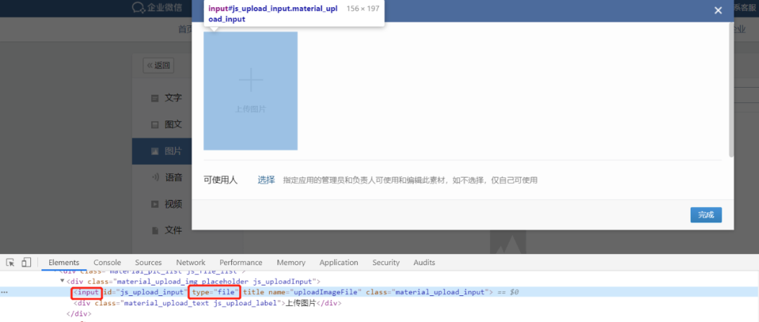 如图所示,是企业微信文件上传的页面 定位到标签为 input,type 为 file 的元素信息,然后使用 send_keys 把文件路径作为值给传进去。