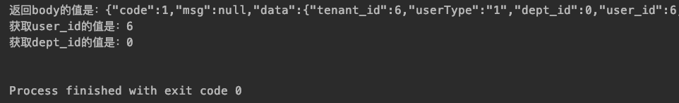 有时候我们可能需要获取ResponseBody中的多个值,例如我们现在想要获取返回体body中的dept_id和user_id,我们就可以利用extract().asString()先将响应结果以json字符串的形式保存下来,再一一根据需要获取,具体写法如下: