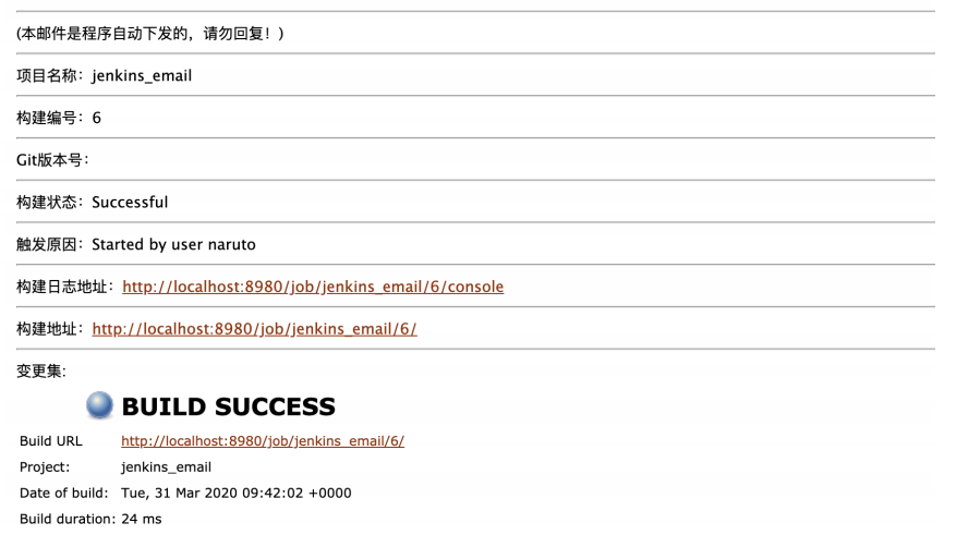 - 构建项目后,所选邮箱收到 Jenkins 构建结果通知