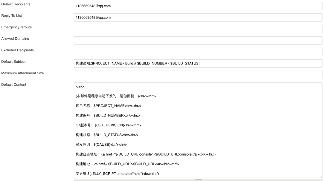 - 找到 Extended E-mail Notification,此处配置邮箱相关信息。此处配置的信息是与之前的邮箱配置所对应的。Password 填写的内容是之前保存的授权码