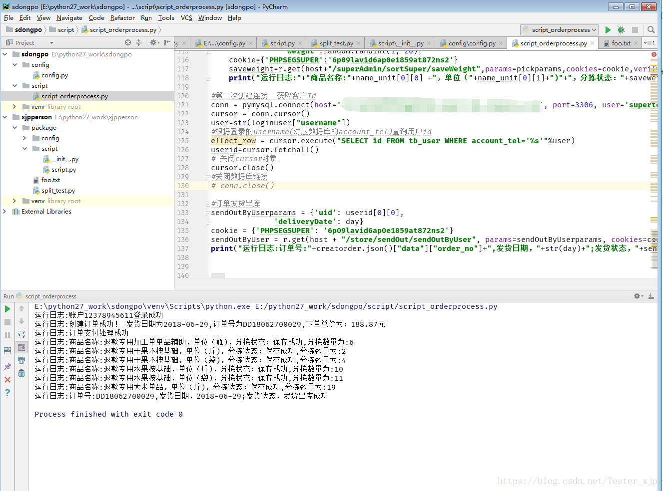 #coding=utf8 import pymysql import sys reload(sys) sys.setdefaultencoding('utf8') import requests import json import random import datetime from requests.packages.urllib3.exceptions import InsecureRequestWarning requests.packages.urllib3.disable_warnings(InsecureRequestWarning) #config host="填你自己的" loginuser1={"username":"15112345678","password":"1"} loginuser2={"username":"15112345679","password":"1"} loginuser3={"username":"15112345670","password":"1"} loginuser4={"username":"13874822433","password":"1"} loginuser5={"username":"13874222438","password":"1"} loginuser6={"username":"16666666666","password":"1"} loginuser7={"username":"18502020505","password":"1"} loginuser8={"username":"15806060202","password":"1"} loginuser9={"username":"17688888888","password":"1"} loginuser10={"username":"17645674567","password":"1"} loginuser11={"username":"13548753520","password":"123456"} loginuser12={"username":"12378945611","password":"1"} #设置发货日期 默认为后二天 需要修改可以更改days today = datetime.date.today() day = today + datetime.timedelta(days=2) #随机选择登录user loginuser=random.choice([loginuser1,loginuser2,loginuser3,loginuser4,loginuser5,loginuser6,loginuser7,loginuser8,loginuser9,loginuser10,loginuser11,loginuser12]) #登录 r=requests.session() login = r.post(host+"/commonApi/wapData/checkLogin",data=loginuser,verify=False) #判断是否登录成功 if((login.json()["status"]) == 1): print("运行日志:账户"+loginuser["username"]+"登录成功") else: print("运行日志:账户登录失败,"+login.json()['message']) #微信商城提交订单 orderdata={'commodity_list':'[{"id":"15071","name":"退款专用加工单单品辅助","price":"9.99","notice":"","unit":"瓶","summary":"","unit_sell":"瓶","unit_num":"1.00","parent_id":"15071","is_time_price":"0","is_collected":"N","order_quantity":"0","price_desc":"9.99","show_price":true,"shopping_amount":0,"convert_price":"9.99","convert_price_desc":"9.99","convert_unit":"瓶","logo":["https://sdpsass.b0.upaiyun.com/supertest/upload_pic/com_thumb_20180619112826cfbf98a95b28785a02a22.png"],"amount":1.33,"$$hashKey":"0NL","checked":true,"commodity_id":"15071"},{"id":"15069","name":"退款专用干果不按基础","price":"4.88","notice":"","unit":"斤","summary":"","unit_sell":"斤","unit_num":"1.00","parent_id":"15069","is_time_price":"0","is_collected":"N","order_quantity":"0","price_desc":"4.88","show_price":true,"shopping_amount":0,"convert_price":"4.88","convert_price_desc":"4.88","convert_unit":"斤","logo":["https://sdpsass.b0.upaiyun.com/supertest/upload_pic/com_thumb_20180619112700f88c44cf5b28780444132.png"],"amount":1.11,"$$hashKey":"0NP","checked":true,"commodity_id":"15069"},{"id":"15070","name":"退款专用干果不按基础","price":"48.80","notice":"","unit":"袋","summary":"","unit_sell":"袋","unit_num":"10.00","parent_id":"15069","is_time_price":"0","is_collected":"N","order_quantity":"0","price_desc":"48.80","show_price":true,"shopping_amount":0,"convert_price":"4.88","convert_price_desc":"4.88","convert_unit":"斤","logo":["https://sdpsass.b0.upaiyun.com/supertest/upload_pic/com_thumb_20180619112700f88c44cf5b28780444132.png"],"amount":1.22,"$$hashKey":"0NQ","checked":true,"commodity_id":"15070"},{"id":"15067","name":"退款专用水果按基础","price":"5.66","notice":"","unit":"斤","summary":"","unit_sell":"斤","unit_num":"1.00","parent_id":"15067","is_time_price":"0","is_collected":"N","order_quantity":"1","price_desc":"5.66","show_price":true,"shopping_amount":0,"convert_price":"5.66","convert_price_desc":"5.66","convert_unit":"斤","logo":["https://sdpsass.b0.upaiyun.com/supertest/upload_pic/com_thumb_20180619112606a9873ab95b2877ce525ee.png"],"amount":1.44,"$$hashKey":"0NV","checked":true,"commodity_id":"15067"},{"id":"15068","name":"退款专用水果按基础","price":"56.60","notice":"","unit":"袋","summary":"","unit_sell":"斤","unit_num":"10.00","parent_id":"15067","is_time_price":"0","is_collected":"N","order_quantity":"0","price_desc":"56.60","show_price":true,"shopping_amount":0,"convert_price":"5.66","convert_price_desc":"5.66","convert_unit":"斤","logo":["https://sdpsass.b0.upaiyun.com/supertest/upload_pic/com_thumb_20180619112606a9873ab95b2877ce525ee.png"],"amount":1.55,"$$hashKey":"0NW","checked":true,"commodity_id":"15068"},{"id":"15066","name":"退款专用大米单品","price":"8.88","notice":"","unit":"斤","summary":"描述啊","unit_sell":"斤","unit_num":"1.00","parent_id":"15066","is_time_price":"0","is_collected":"N","order_quantity":"1","price_desc":"8.88","show_price":true,"shopping_amount":0,"convert_price":"8.88","convert_price_desc":"8.88","convert_unit":"斤","logo":["https://sdpsass.b0.upaiyun.com/supertest/upload_pic/com_thumb_20180619112518820d69275b28779ec78ad.png"],"amount":1.66,"$$hashKey":"0O1","checked":true,"commodity_id":"15066"}]', 'op_source':'7',#提交方式7是小程序 2是微信支付 'op_action':'1', 'delivery_date':day } creatorder=r.post(host+"/commonApi/wapData/createOrder",data=orderdata,verify=False) #orderjson=json.dumps(creatorder.json(),ensure_ascii=False,indent=4) #判断是否提交订单成功 if((creatorder.json()["status"]) == 1): print("运行日志:" + creatorder.json()["message"] +" 发货日期为"+str(day)+ ",订单号为" + creatorder.json()["data"]["order_no"]+",下单总价为:"+str(creatorder.json()["data"]["price"])+"元") else: print("运行日志:提交订单失败," + creatorder.json()["message"]) #微信商城订单货到付款方式 payorder={"order_type":"=0", "order_no":creatorder.json()["data"]["order_no"]} payorder=r.post(host+"/commonApi/pay/index",data=payorder,verify=False) #判断是否支付成功 if((payorder.json()["status"])==1): print("运行日志:订单支付"+payorder.json()["message"]) else: print("运行日志:订单支付失败,"+payorder.json()["message"]) #连接数据库,获取分拣id #创建连接 conn = pymysql.connect(host='填你自己的', port=3306, user='supertest', passw