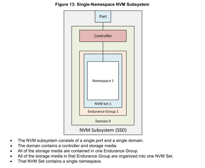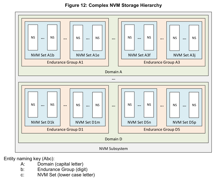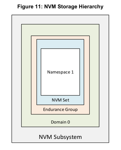 - 配合其他层级实现存储系统的层次化管理:Namespace 是 NVM 存储模型的重要组成部分,与 NVM Set、Endurance Group、Domain 等层级相互配合,形成了一个完整的存储层次结构。每个命名空间完全包含在一个 NVM Set 中,NVM Set 又与 Endurance Group 相关联,最终由 Domain 进行统一管理。这种层次化的管理结构使得存储系统的管理更加清晰和有序,有助于提高系统的整体性能和可扩展性。