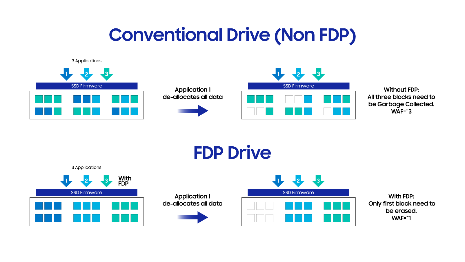 FDP(Flexible Data Placement,灵活数据放置),是 NVMe 2.1 标准(2024 年发布)中引入的一项新技术,也是一个可选功能,核心目标是降低 SSD 的写放大(WAF)。简单来说,它让主机(如电脑、服务器)能更精准地控制数据在 SSD 内部的存储位置,从而: