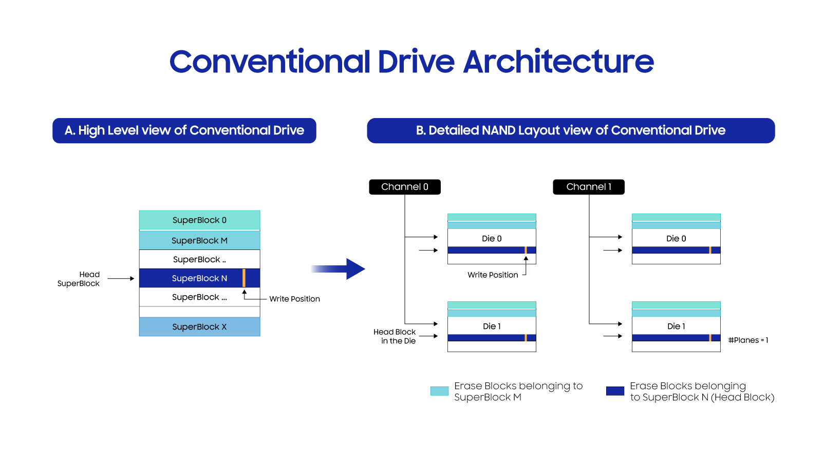 - 固件把 NAND 这个 “大房间” 划分成 SuperBlock 来管理,就像把房间划分为几个小区域。每个 SuperBlock 从所有 Channel,所有 Die 0 中取一个 NAND Block 绑定组合而成,这是为了 NAND 能同时编程并实现最大吞吐量而设计的。