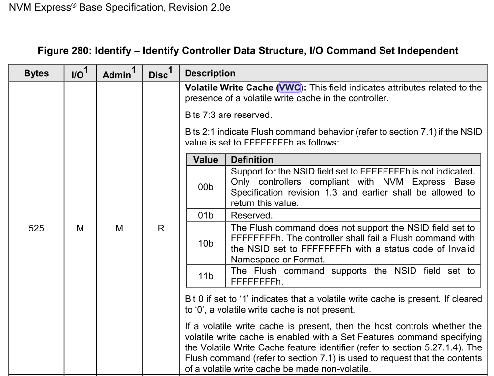 Flush 能否生效,首先关注 SSD 是否支持 VWC?需要通过 Identify 查看 VWC field 状态。