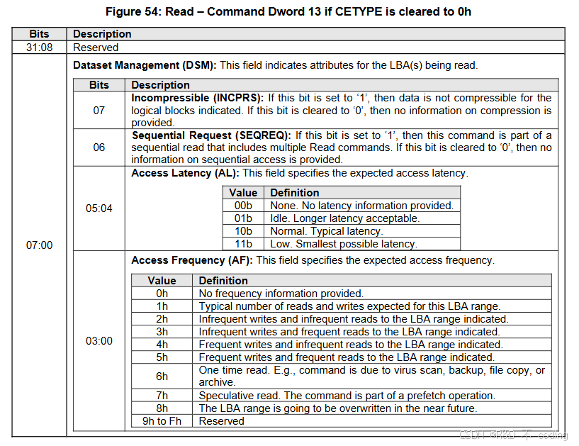 在 NVMe Read 命令的 “参数工具箱” 里,Command Dword 14 是个 “智能导航系统”—— 用 8 个核心比特(Bits 07~00)定义了读取数据的 “压缩特性、顺序属性、延迟需求、访问频率”,还藏着 “一次性读取”“预读取” 等特殊场景标识。它就像给 Read 命令装了 “导航仪”,让 SSD 控制器提前知道 “这数据该怎么读才高效”。今天咱们看它怎么帮 Read 命令 “少走弯路”。