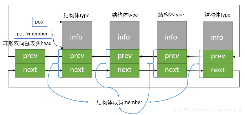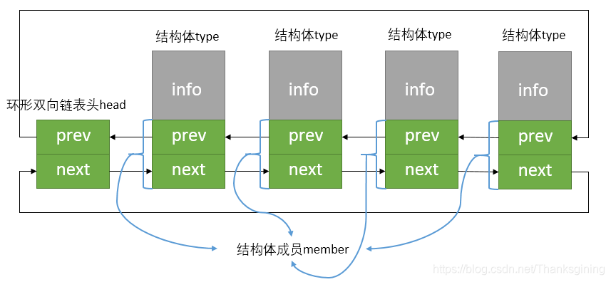 如果在链表中添加相关数据,改如何操作呢?Linux内核将链表节点直接放在数据结构中,然后把这些数据结构添加到以head为头的环形双向链表中,如下图所示: