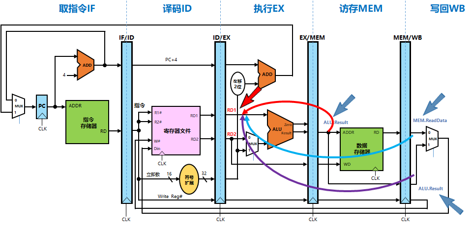 修改气泡流水线,将数据相关处理方式改成数据重定向,注意所有指令都在EX段执行,包括分支指令。