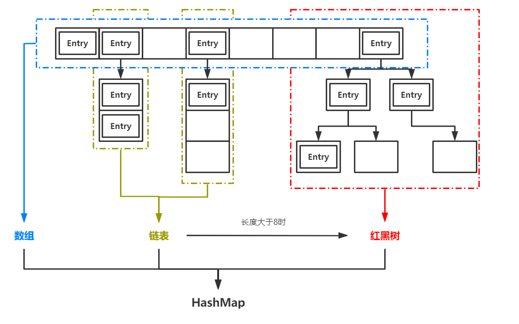 在JDK1.8中,当链表的长度大于阈值8时,这时这个链表将会转化成红黑树以提升查找效率。为什么阈值是8呢?请读者不妨思考一下这个问题,在文章末尾笔者将给出原因。(提示:想一想在红黑树和链表中查找一个元素的复杂度)