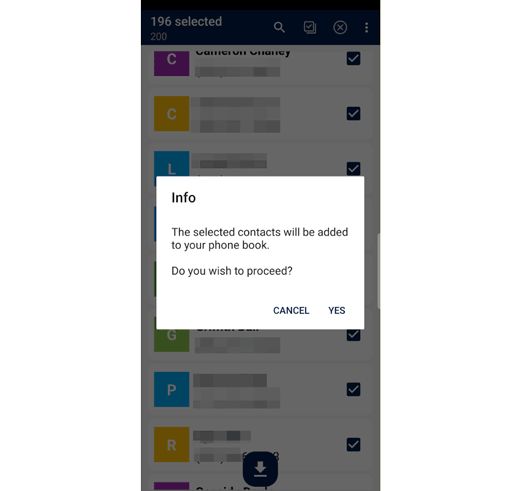 步骤三:选中后,点击“下载”箭头图标,然后点击“是”。之后,联系人将出现在您的“通讯录”应用中。