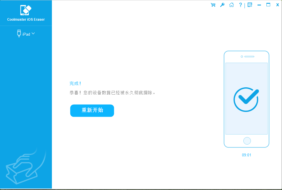 02 iPad 连接成功后,您将看到如下所示的主界面。点击“抹掉”按钮,即可开始擦除设备上的数据。