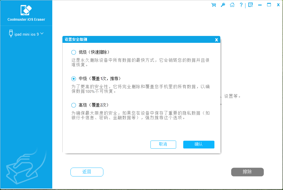 03请点击旁边的菜单“安全级别”,选择擦除的安全级别:“低”、“中”或“高”。选择完成后,点击“确定”按钮。