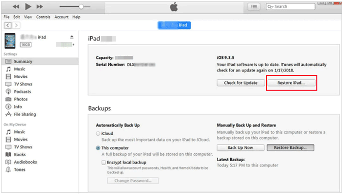 方法三:如何通过 iTunes 删除 iPad 上的所有内容