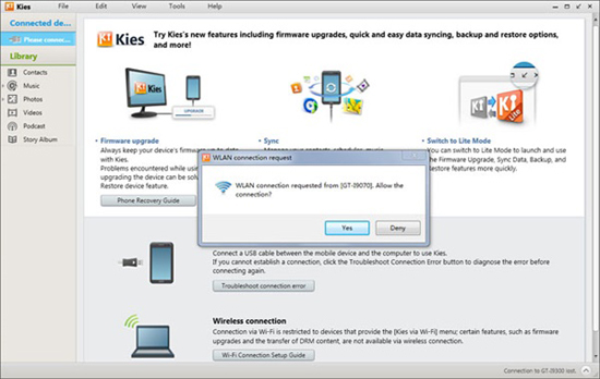 Samsung Kies 会立即检测到您的设备,并向您发出通知,您应该点击“是”按钮。