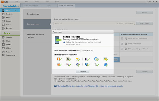 步骤 1. 更改为“恢复数据”选项,Kies 将自动加载您已备份的文件。