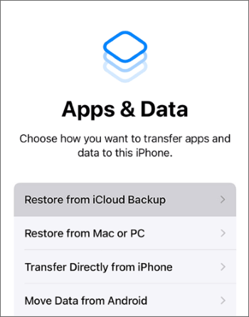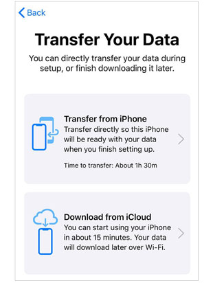 步骤 3. 断开旧 iPhone 的连接并连接新 iPhone。设置您的新 iPhone,直至到达“应用程序和数据”屏幕。