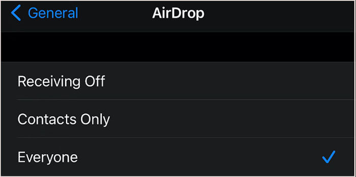 步骤 2. 在两台设备上打开 AirDrop,然后选择将文件传输到旧设备上的“仅限联系人”或“所有人”。