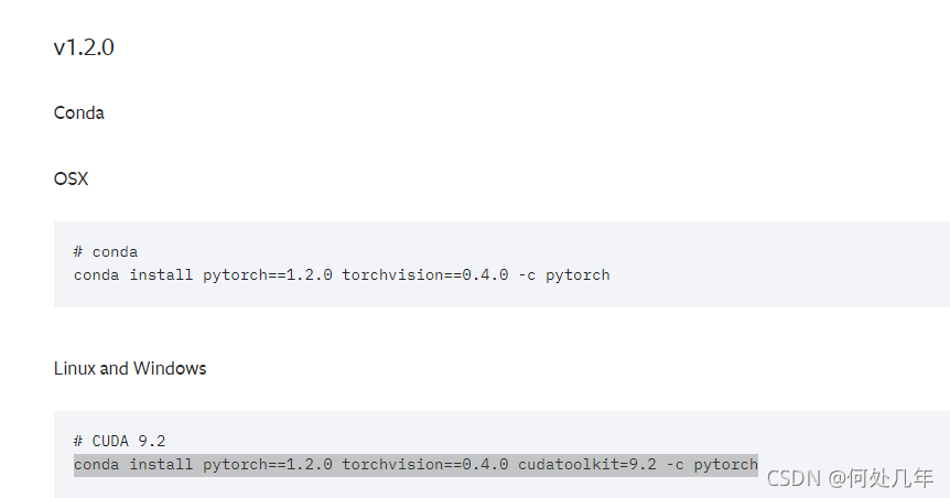4.2 选择对应的pytorch版本安装 (我:1050显卡,cuda版本9.2,安装的1.2版本的pytorch)