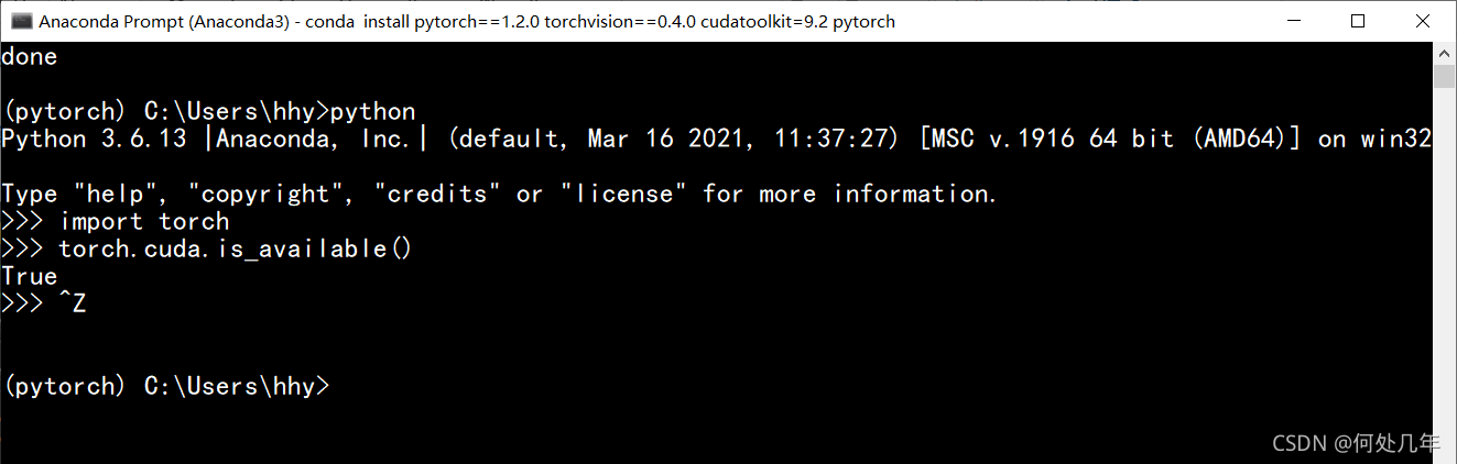 5.安装完成;进入python,调用torch库,torch.cuda.is_available()函数,返回true则完成