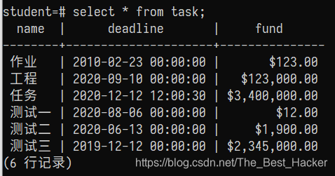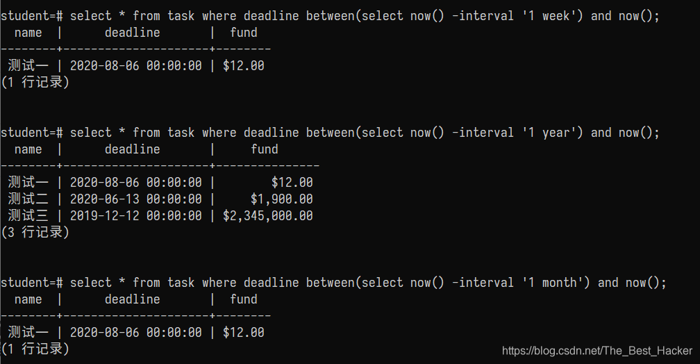 近一月:select * from task where deadline between(select now() -interval '1 month') and now();