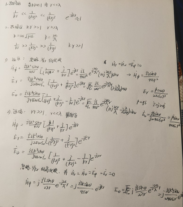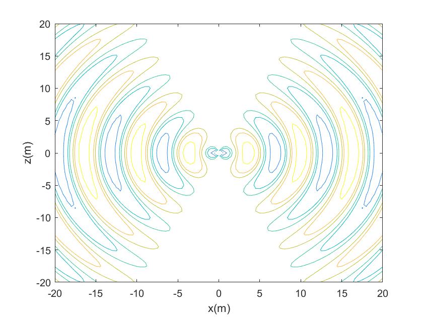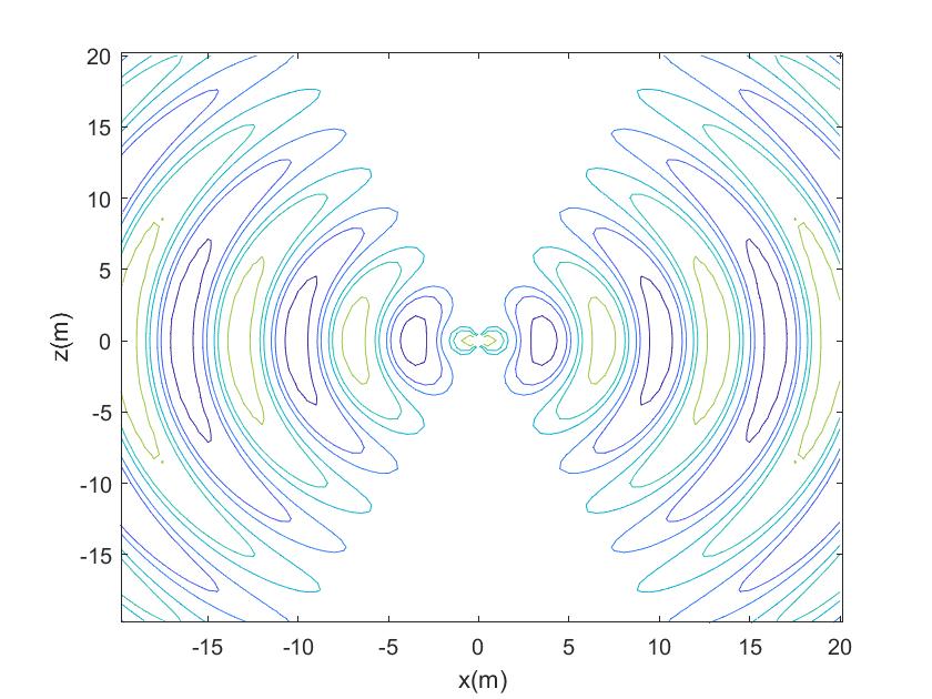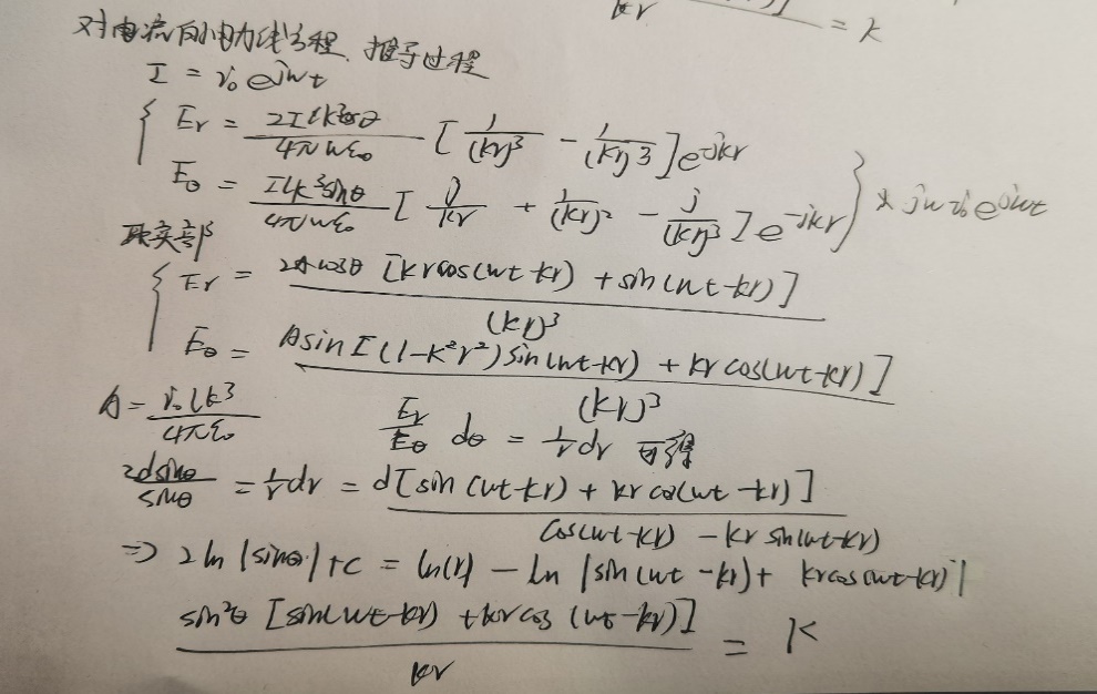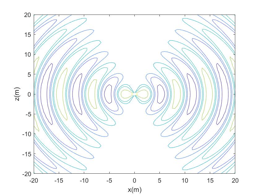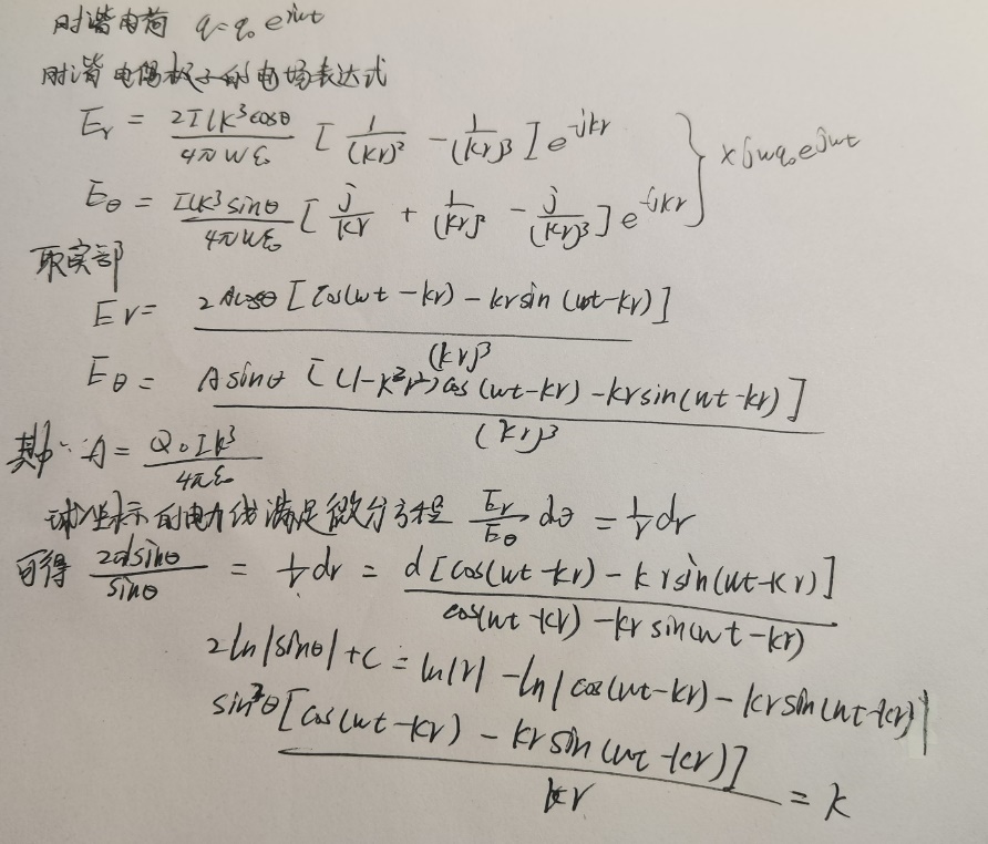 根据电偶极子的电场表达式,推导电力线方程,采用MATLAB绘制电偶极子的在近场区、远场区的电场随时间动态分布图,分析电偶极子辐射特点。