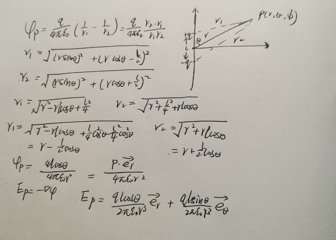 根据电偶极子的电位函数和电场强度函数,基于MATLAB编程,绘制空间任意一点的位置坐标,算出这一点的电位和电场分布。