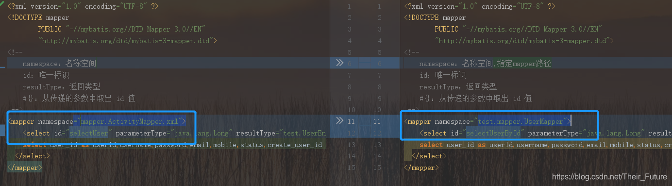 sql映射文件中 namespace 改为 UserMapper 接口的全类名,这样的做法让映射文件与接口形成了绑定;sql id也与UserMapper接口中方法名一样。