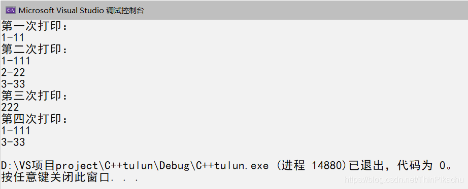 我们知道,键值对中的键(key)必须唯一,前面我们已经将映射关系(键值对)1->11,插入到map容器中了,所以就算这时我们重新创建一个映射关系(键值对)1->11,并将它插入到map容器当中,系统也会将它忽略掉,不作任何处理,这一点我们可以从上面打印的结果中可以看到。