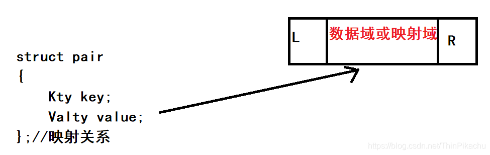 我们看到map底层二叉树的一个节点被分为3个域,分别是左孩子域,右孩子域和数据域(映射域),而这里的映射域中存放的就是结构体pair定义的映射关系,也就是我们上面提到过的键值对,我们来看一下结构体pair的类型。