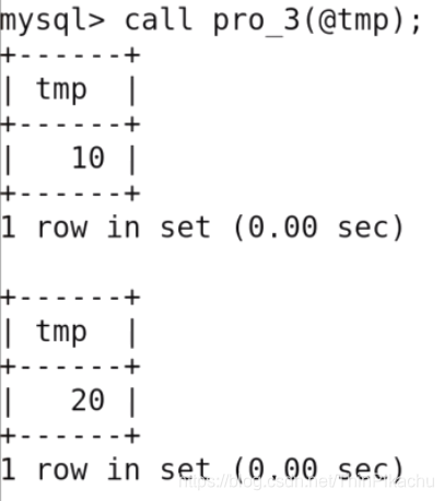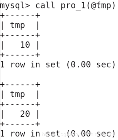接着我们先将结束符修改为&,然后创建一个存储过程,它的参数为一个输入型的参数 tmp,进入存储过程后,我们先查看它的值,在将他(形参tmp)的值赋为20,然后再查看它的值,最后将结束符修改为;,然后我们使用call命令来调用这个存储过程。并给它传入实参tmp。具体结果如下: