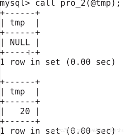 我们发现此时实参tmp的值也变为了20。而且我们发现在存储过程中第一次查看tmp的值时,打印的结果为NULL,所以在OUT定义的输出型参数中,只有在最后时才将形参数据的值输出到实参中。