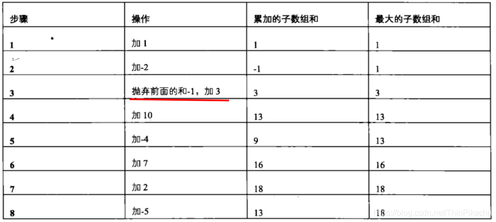 13保存下来,它有可能是最大的子数组的和。第六步加上数字7,9加7的结果是16,此时和比之前最大的和13还要大,把最大的子数组的和由13更新为16。第七步加上2,累加得到的和为18,同时我们也要更新最大子数组的和。第八步加上最后一个数字-5,由于得到的和为13,小于此前最大的和18,因此最终最大的子数组的和为18,对应的子数组是{3,10,-4,7,2}。整个过程可以用下表总结如下: