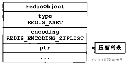 ziplist编码的压缩列表对象使用压编列表作为底层实现,每个集合元素使用两个紧挨在一起的压缩列表节点来保存,第一个节点保存元素的成员,而第二个元素则保存元素的分值。压缩列表内的集合元素按分值从小到大进行排序,分值较小的元素被放置在靠近表头的方向,而分值较大的元素则被放置在靠近表尾的方向。