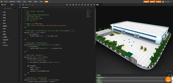 实际应用一下,在数字孪生可视化场景中创建鼠标单击事件,打印拾取到的物体id;鼠标双击事件,原地创建个球;并给所有建筑对象添加鼠标滑过事件。