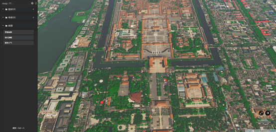 下图所示为 CityBuilder 的编辑界面。默认初始视角为北京市地区。鼠标左键控制场景(前、后、左、右)位置移动,鼠标右键控制场景(仰角、俯角)角度大小。