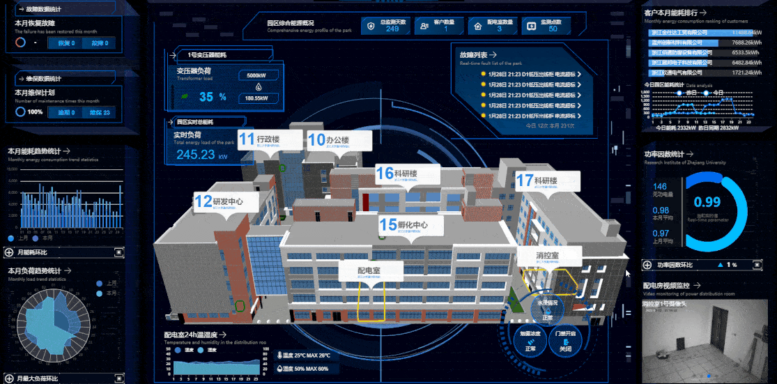 基于三维虚拟空间的仿真技术,采用3D仿真技术,可直观展示综合能源园区里楼宇、供电设备、供电管路,供水管路、暖通管路等的位置分布,通过统一的应用集成能力,融合各业务系统数据,向上层应用提供直观、便利、全局的基础支撑能力。