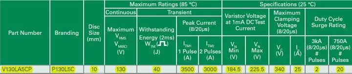 MOV的额定工作电压,交流场合考虑交流额定电压,即Vrms或Vm(ac),上图中的器件可以有效值130V的交流电中正常工作。超过这个电压,MOV可能动作或者损坏,导致电路无法工作。