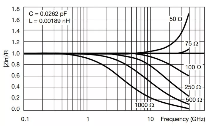 上图电阻的高频特性非常好,可以看到极间电容只有0.03pF,引线电感只有0.002nH,其中75Ω的电阻可以到30GHz。我们通常使用的贴片电阻大都是厚膜电阻,性能远达不到如此,其引线电感有几个nH,极间电容也有几个pF,大多只能用到几百MHz或几个GHz。
