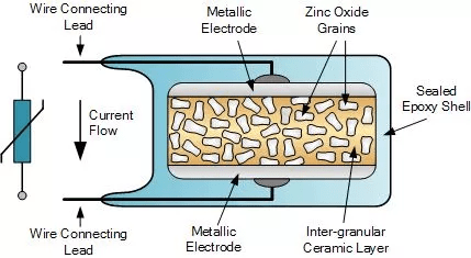 压敏电阻通常都是金属氧化物可变电阻,即Metal Oxide Varistor(MOV),其电阻材料是氧化锌颗粒和陶瓷颗粒混合后一起烧结成型。MOV的特性就是当电压超过一定阈值的时候,电阻迅速下降,可以通过大电流,因此可以用于浪涌防护和过压保护。
