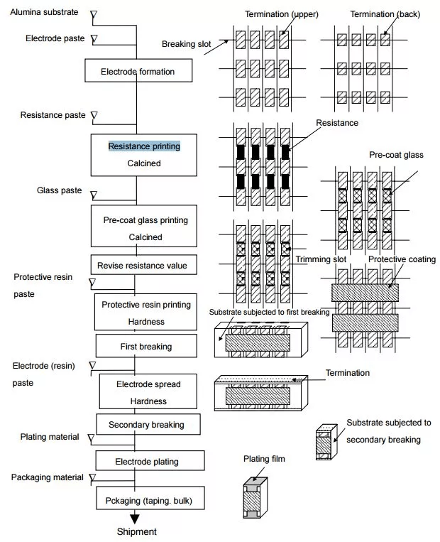 厚膜电阻采用的丝网印刷法,就是再陶瓷基底上贴一层钯化银电极,然后在电极之间印刷一层二氧化钌作为电阻体。厚膜电阻的电阻膜通常比较厚,大约100微米。具体工艺流程如下图所示。
